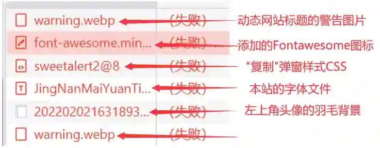 具体表现在博客上就是以下js均无法通过纯国内的网络环境Get到,通过开发者工具查看均变红